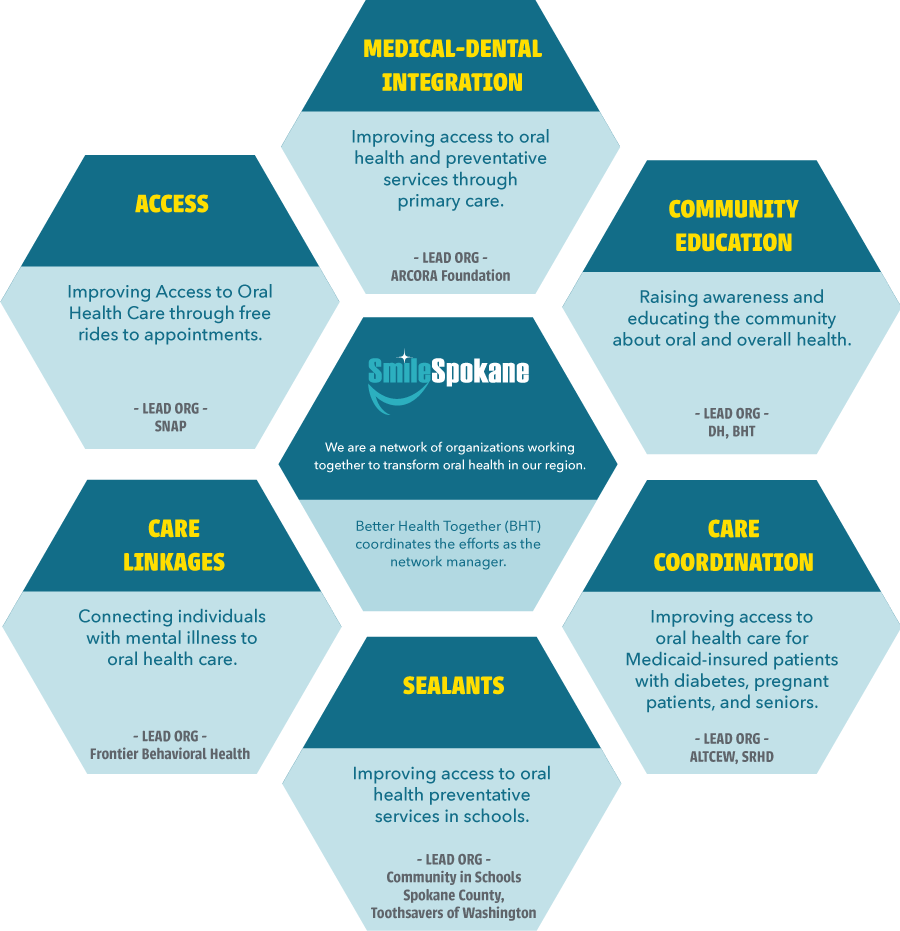 Made up of organizations from health care, public health, social services, and community groups, Smile Spokane works together to transform the oral health system in our region so everyone can enjoy better oral and overall health and well-being.